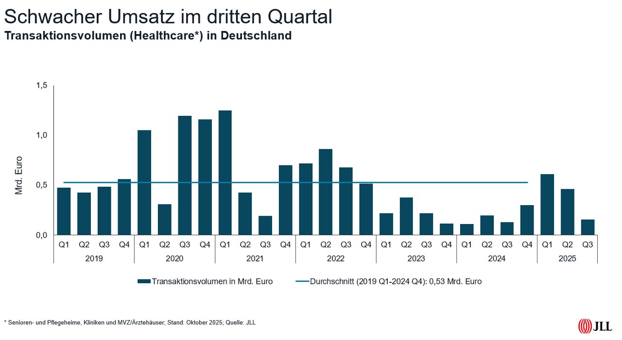 39 Abschlüsse wurden in den ersten drei Quartalen 2025 registriert. Im Vorjahreszeitraum waren es 19. Pflegeheime haben mit 84 Prozent den höchsten Anteil am Gesamtumsatz, dahinter folgen Kliniken mit einem Marktanteil von 15 Prozent sowie Ärztehäuser mit einem Prozent. Internationale Investoren halten sich zurzeit in Deutschland eher zurück: 80 Prozent des Transaktionsvolumens wurde mit einheimischem Kapital gestemmt und damit mehr als in der Vergangenheit.