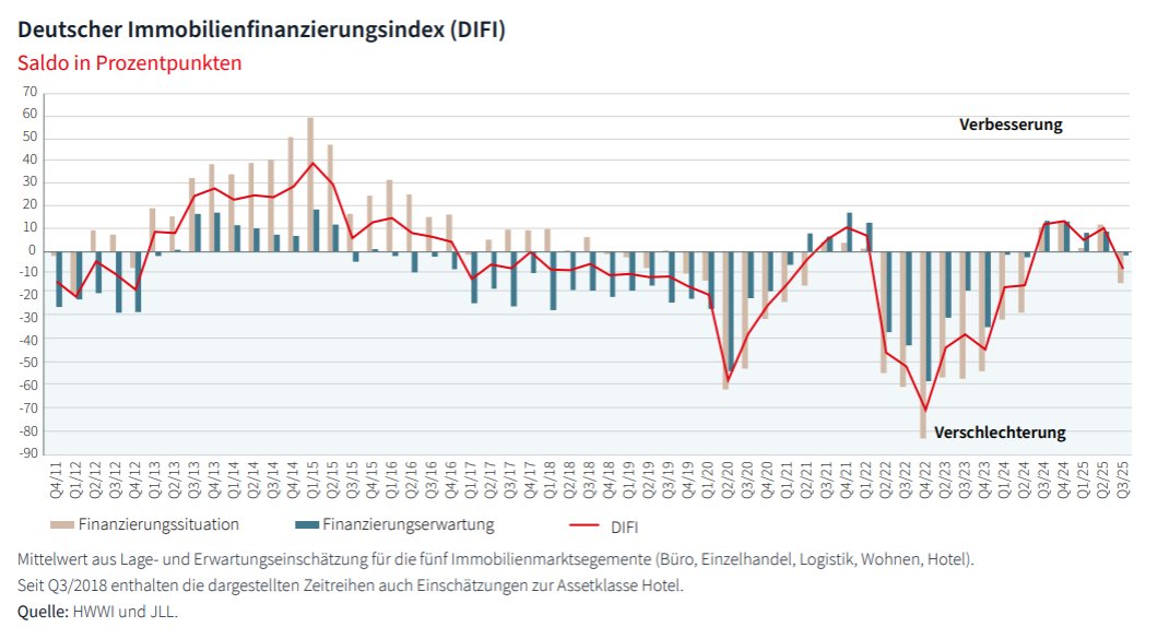FRANKFURT, 27. Oktober 2025 – Am deutschen Immobilienfinanzierungsmarkt hat sich die Stimmung unter den Marktakteuren im dritten Quartal 2025 verschlechtert. Der Deutsche Immobilienfinanzierungsindex (Difi)* hat im Vergleich zum Vorquartal 18,1 Punkte verloren und ist erstmals in diesem Jahr in den Minusbereich gerutscht. Mit einem Stand von minus 7,6 Punkten notiert der Difi allerdings nach wie vor deutlich oberhalb des Tiefststands von Ende 2022 (minus 69,7 Punkte).