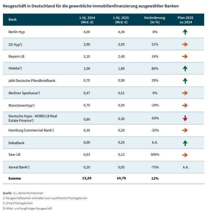 Die aktuellen Zahlen zum Neugeschäft zeigen, dass sich der deutsche Immobilienfinanzierungsmarkt erholt. Neben traditionellen Banken drängen vermehrt spezialisierte und internationale Finanzierer in den Markt. Dazu zählen ebenfalls regionale Sparkassen, Volksbanken und Versicherungsgesellschaften, die vermehrt auch bei großvolumigen Transaktionen für eine verbesserte Liquiditätssituation sorgen. Gleichzeitig etablieren sich Debt Funds weiter als wichtige Kapitalquelle. „Wir erwarten, dass die Belebung bei Immobilienfinanzierungen anhält. Das gilt insbesondere für das Büro- und Einzelhandelssegment. Insbesondere die traditionellen Immobilienfinanzierer werden sich in ihren Neugeschäftsplänen für 2026 höhere Ziele setzen als für 2025“, prognostiziert Dominik Rüger, Team Leader Debt Advisory JLL Germany.