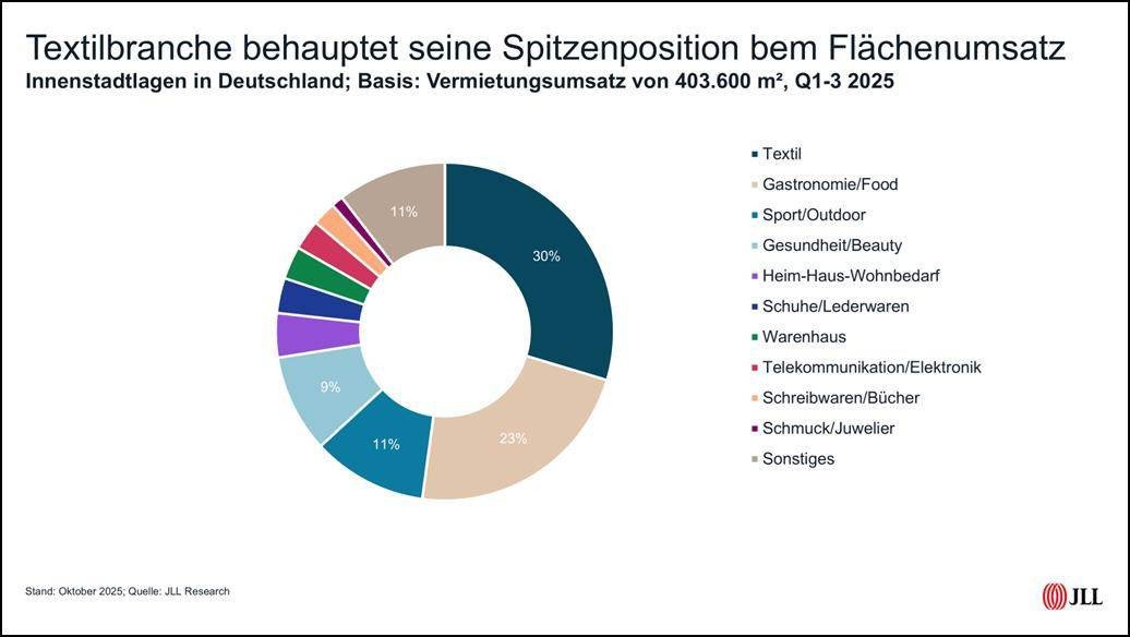Die expansivste Mietergruppe waren erneut die Textilhändler mit einem Flächenanteil von rund 30 Prozent am gesamten Umsatz. Etwa 43 Prozent des Flächenumsatzes der Textilhändler entfiel auf die zehn bedeutendsten Einzelhandelsmärkte in Deutschland. Unter den zehn Mietern mit den meisten Anmietungen waren zur Hälfte Unternehmen aus dem Bereich Young Fashion aktiv, aber auch der Textildiscounter TK Maxx und das dänische Kindermodelabel „Name it“ mit jeweils sechs Anmietungen sowie die Dessous-Marken Calzedonia und Schiesser mit jeweils drei Anmietungen.