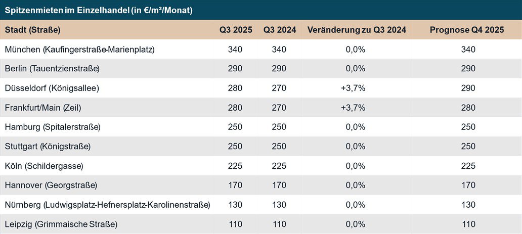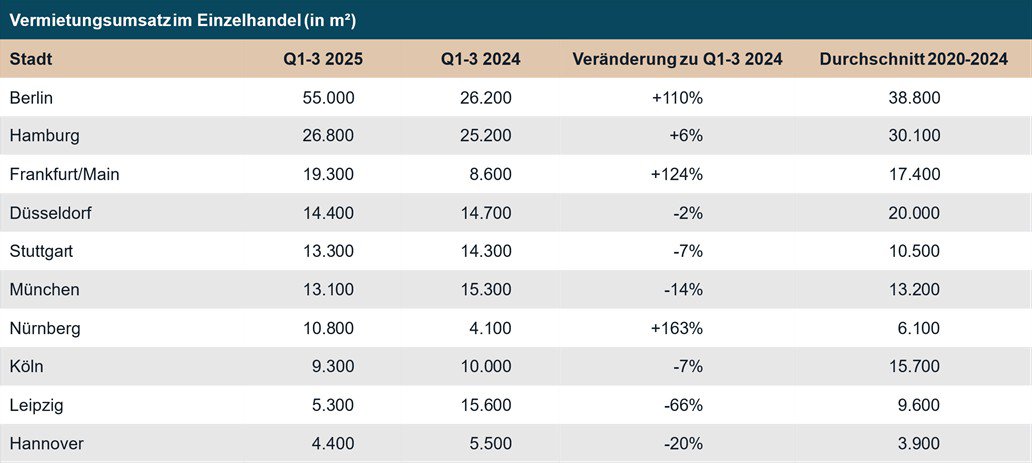 Auf die zehn bedeutendsten Einzelhandelsmärkte in Deutschland entfielen in den ersten drei Quartalen 2025 rund 171.700 m² Flächenumsatz. Unter diesen Metropolen war erneut Berlin der Markt mit dem höchsten Anteil und einer Vermietungsleistung von 55.000 m², was mehr als einer Verdopplung gegenüber dem Vorjahreszeitraum entspricht. Auch Frankfurt am Main (plus 124 Prozent) und Nürnberg (plus 163 Prozent) konnten sich im Vorjahresvergleich deutlich steigern, wenn auch auf einem deutlich niedrigeren absoluten Niveau als Berlin.