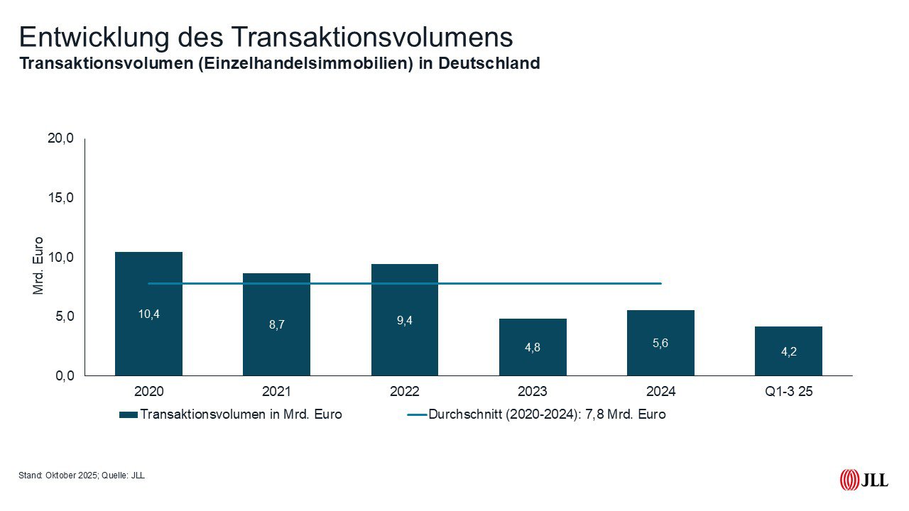 FRANKFURT, 15. Oktober 2025 – Der Investmentmarkt für Einzelhandelsimmobilien hält seinen Vorsprung von zehn Prozent im Vergleich zum Vorjahr auch im dritten Quartal 2025 konstant bei. Mit einem Quartalsvolumen von knapp mehr als 1,3 Milliarden Euro kommt der Markt im bisherigen Jahr auf zusammengenommen 4,2 Milliarden Euro, was die Vergleichszeiträume der vergangenen beiden Jahre jeweils um rund ein Zehntel übertrifft. Auch die Zahl der Transaktionen im Jahresvergleich stieg um 22 auf aktuell 169. Doch sind darunter nur fünf Großabschlüsse mit mehr als 100 Millionen Euro, zwei davon im dritten Quartal abgeschlossen – so dass beim Transaktionsvolumen weiterhin eine spürbare Kluft zum Fünf- oder Zehnjahresschnitt herrscht.