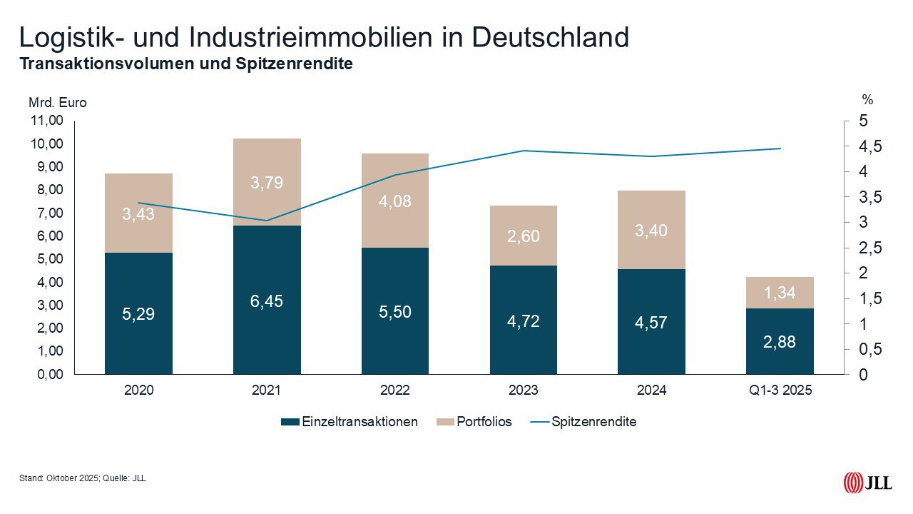 FRANKFURT, 21. Oktober 2025 – Der deutsche Investmentmarkt für Logistik- und Industrieimmobilien hat sich im dritten Quartal 2025 spürbar erholt und den Rückstand zum Vorjahr auf elf Prozent reduziert. Zum Halbjahr hatte dieser noch bei 24 Prozent gelegen. Im dritten Quartal hat der Markt ein Transaktionsvolumen von 1,8 Milliarden Euro erzielt und damit den mit Abstand höchsten Quartalswert in diesem Jahr. Insgesamt stehen so nach drei Quartalen 4,2 Milliarden Euro zu Buche. Dabei stieg die durchschnittliche Dealgröße deutlich von 20 Millionen Euro im Vorquartal auf 30 Millionen Euro, weshalb auch bei einem Rückgang auf 61 Transaktionen nach 65 im zweiten und 67 im ersten Quartal ein deutlich höheres Volumen erzielt wurde.