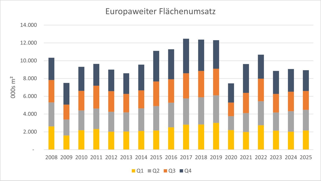 Vergleicht man die Regionen untereinander, sank der Flächenumsatz in Mittel- und Osteuropa im letzten Quartal 2025 im Jahresvergleich um acht Prozent auf 230.000 m². Auch in Westeuropa reduzierte sich der Wert um acht Prozent auf insgesamt 2,1 Millionen m².