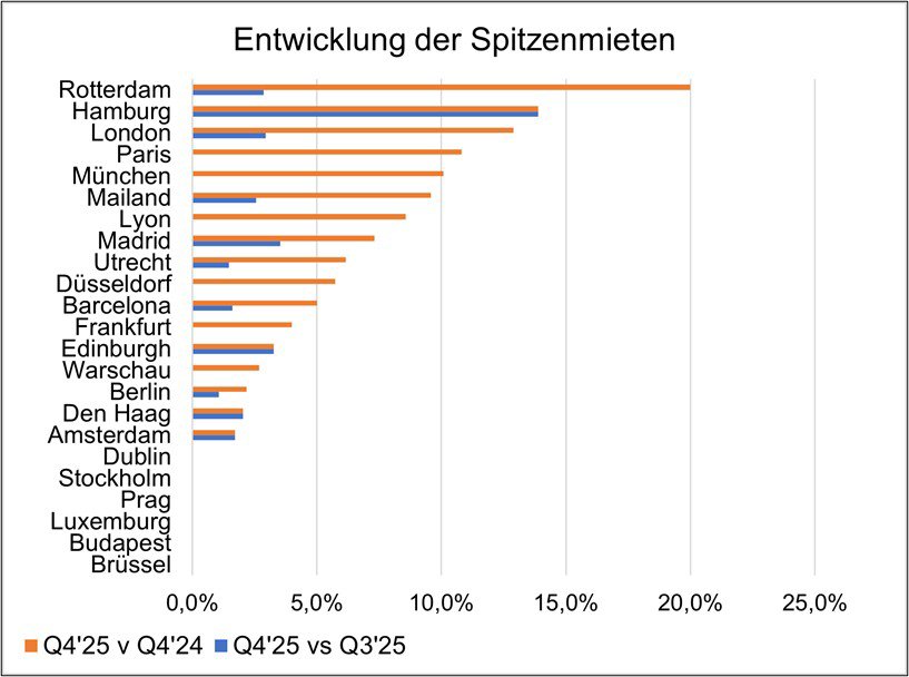 Mietsteigerungen wurden in elf der 23 Indexmärkte beobachtet, darunter Hamburg (plus 13,9 Prozent im Vergleich zum Vorquartal), Madrid (plus 3,5 Prozent), Edinburgh (plus 3,3 Prozent), London (plus 2,9 Prozent) und Rotterdam (plus 2,9 Prozent). Die übrigen zwölf Märkte verzeichneten im vierten Quartal kein Mietwachstum.