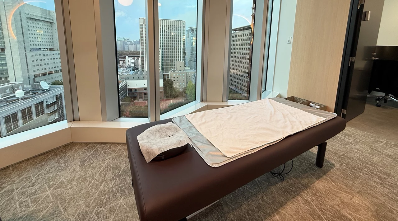 東京オフィスが統合移転したのが2022年11月のこと。約3カ月の準備期間を経て2023年2月にマッサージルームが本格的に稼働開始しました。ヘルスキーパーの後藤 奈美さんが常駐し、1日の利用枠は7つ、1回約35分のボディメンテナンスが受けられます。